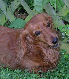 Canterbury's Little Candace - miniature long-haired dachshund of champion quality, but too shy to show, Candace had several puppies and came to Sananjaleen/June Hughes at five years old. So sweet and loving, she dearly loves her many human and animal friends and is of major importance during their meditation and Quantum Touch healing workshops, often asking to be lifted up onto the table with the "client."